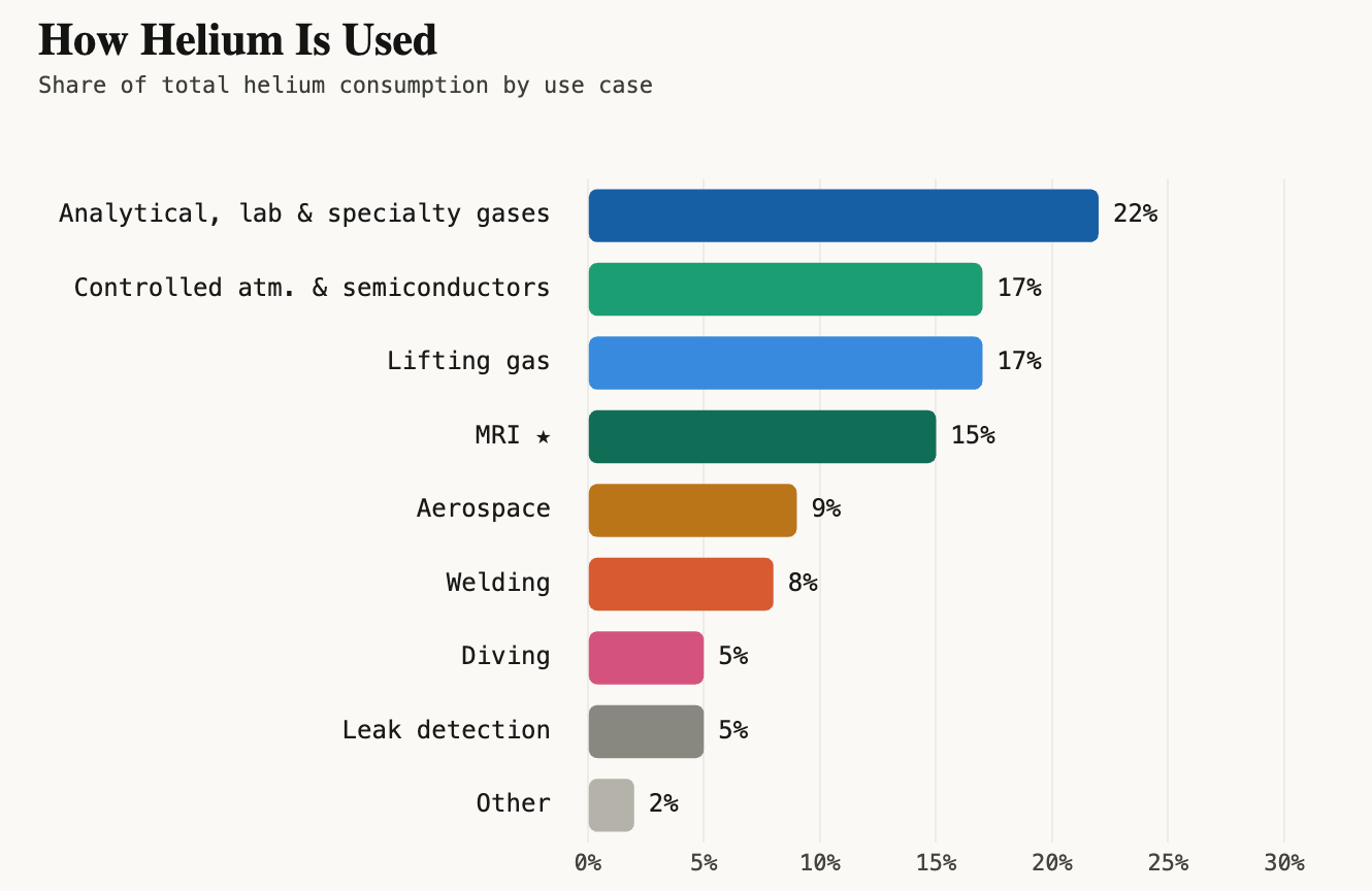 Every MRI machine holds roughly 1,500 litres of liquid helium, which slowly evaporates and needs to be refilled regularly. According to the USGS, MRI machines account for roughly 15% of all helium use, making it one of the largest end uses of the gas.Β