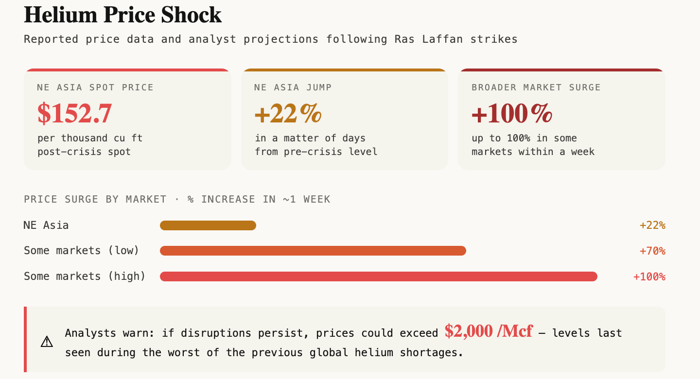 The market's response was immediate, and it showed in prices. Spot prices β which had been softening through late 2025 β doubled within days of Qatar's production halt.Β