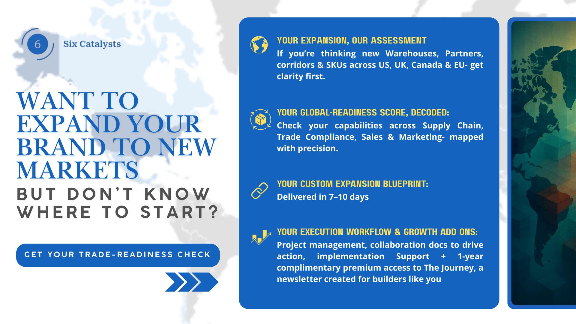 CrossDock Insights: International expansion isn’t a marketing move — it’s a supply-chain and compliance commitment. Companies burn six figures by entering new markets with weak logistics models, misaligned regulations, and fragile demand assumptions. The Trade Readiness Scorecard by Six Catalysts gives you a fast, fixed-fee gut check for the U.S., Canada, UK, or EU — no bloated consulting, no slide decks, just clarity before you commit.