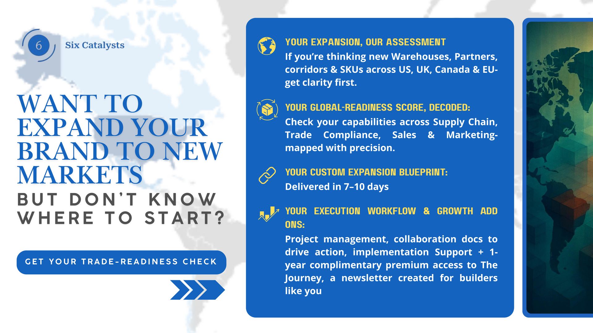 CrossDock Insights: International expansion isn’t a marketing move — it’s a supply-chain and compliance commitment. Companies burn six figures by entering new markets with weak logistics models, misaligned regulations, and fragile demand assumptions. The Trade Readiness Scorecard by Six Catalysts gives you a fast, fixed-fee gut check for the U.S., Canada, UK, or EU — no bloated consulting, no slide decks, just clarity before you commit.