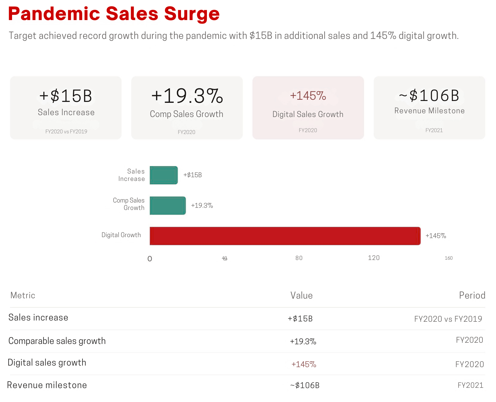 In 2020, Target's full-year sales grew by more than $15 billion β greater than the retailer's total sales growth over the previous 11 years combined. Comparable sales jumped 19.3%, while digital sales surged 145%. And in 2021, Target crossed the $100 billion mark in annual revenue.Β