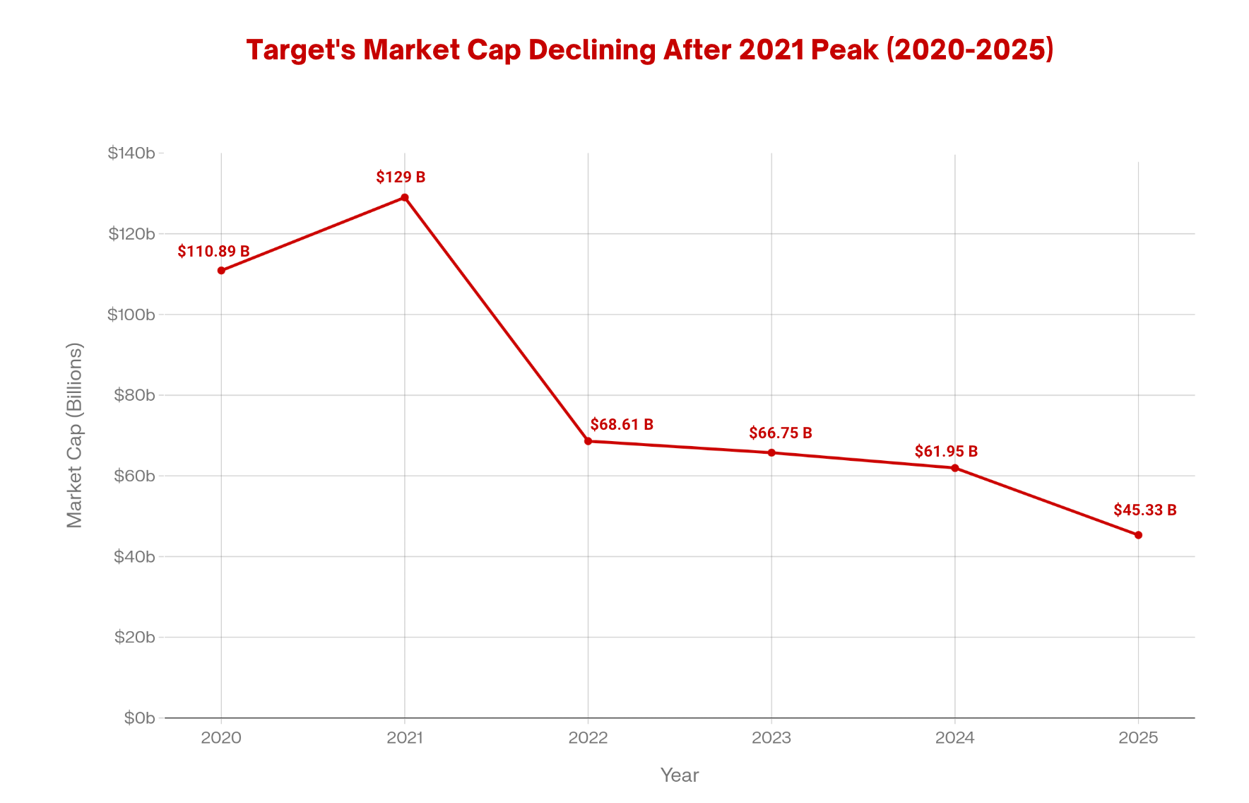 By August 2025, the damage was staggering: Target's market capitalization had fallen to $45.33 billion β down from $129 billion in 2021.Β