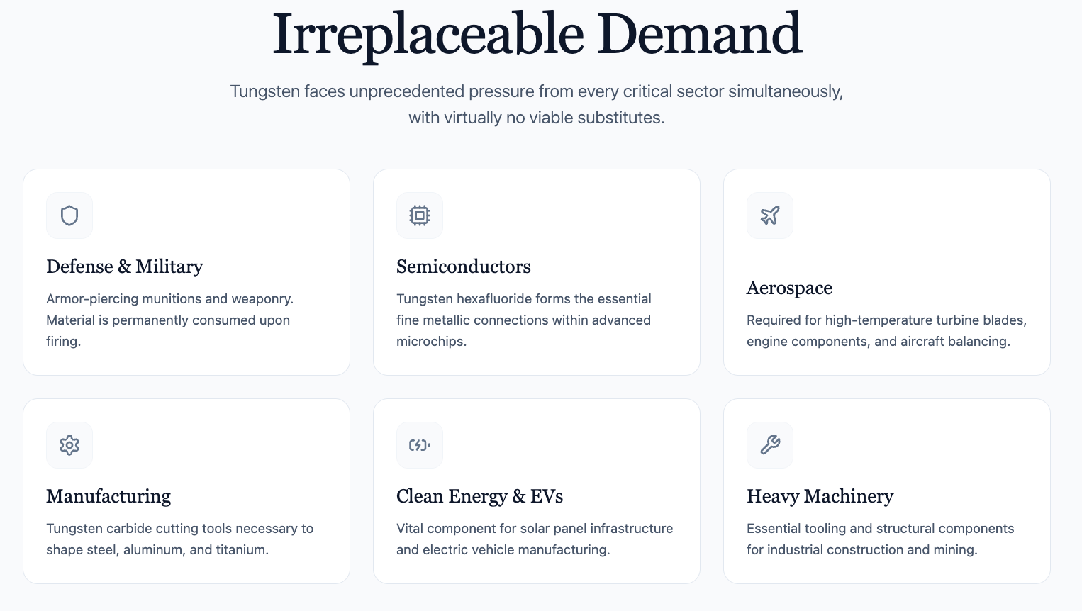 Add solar panels, EVs, heavy machinery, and industrial tooling to the list, and the result is a metal facing rising demand from almost every strategic industry at once. Interestingly, tungsten, because of its unique properties, is almost impossible to replace in any of these sectors.
