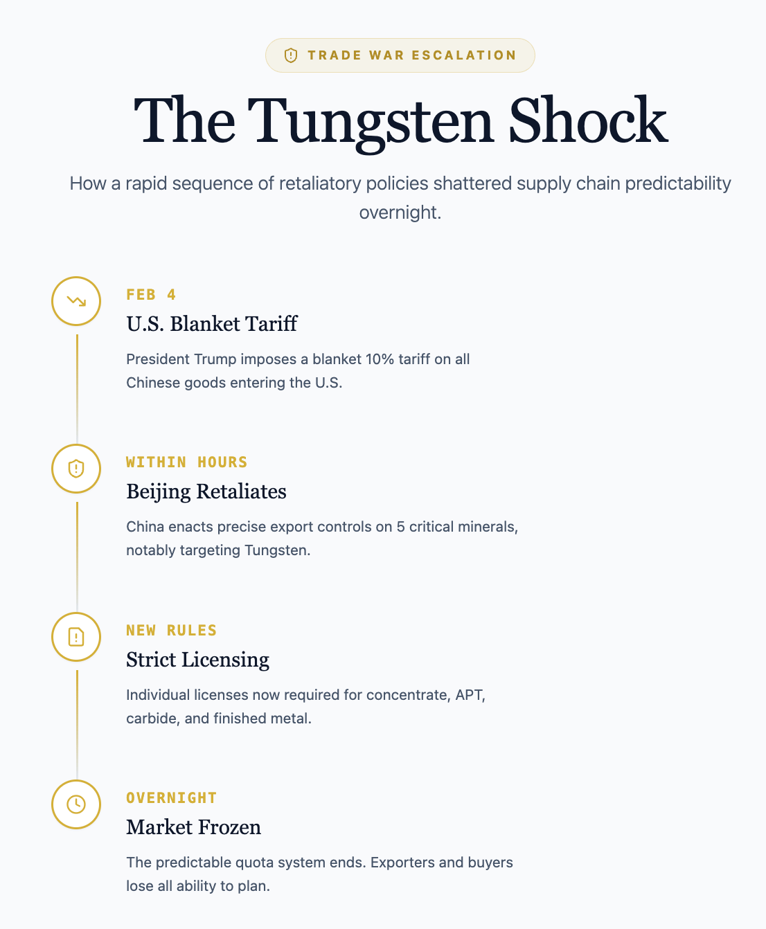 Beijing retaliated within hours. Not just with tariffs alone, but with something far more precise: export controls on five critical minerals, including tungsten.