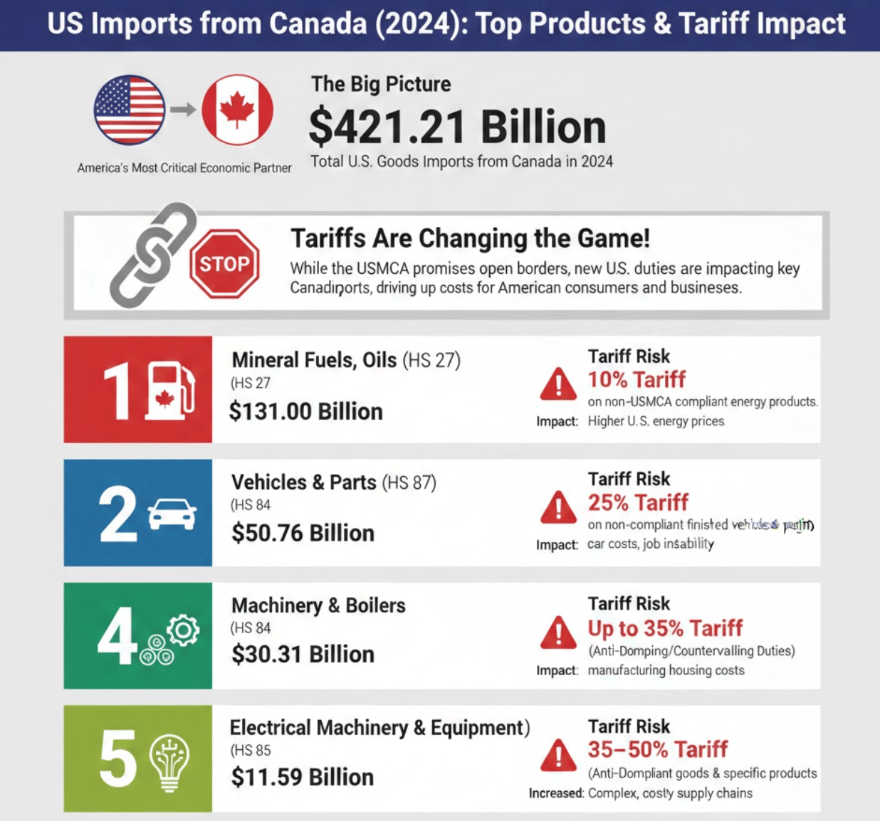 Here are the top products the U.S. imports from Canada, detailing both their massive trade value and the specific tariff risk they face.