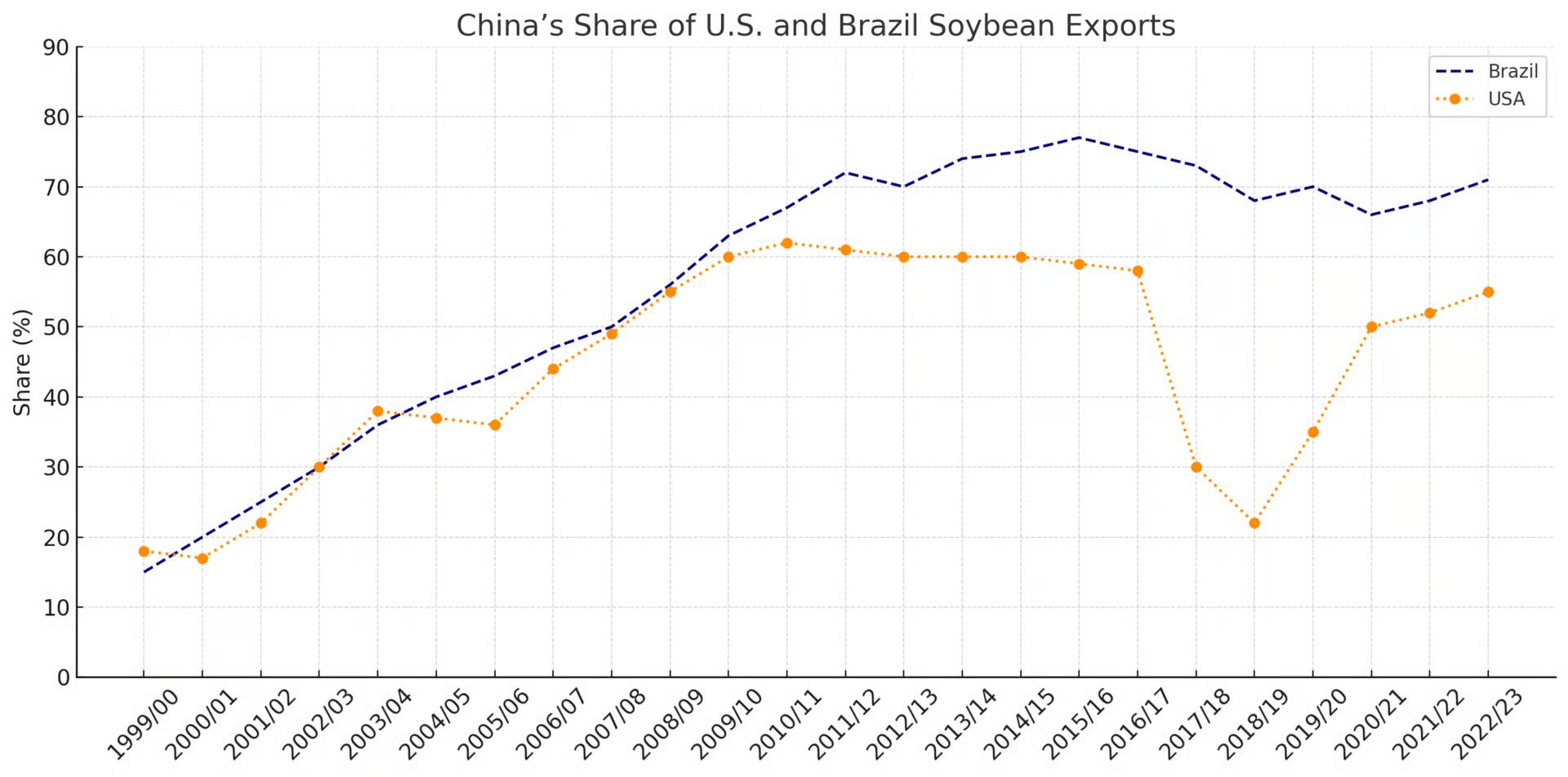 Through the 2000s and 2010s, China consistently accounted for 50–60% of all U.S. soybean exports, according to USDA data. At its peak in 2016, U.S. soybean exports to China reached 36 million metric tons, worth more than $14 billion.